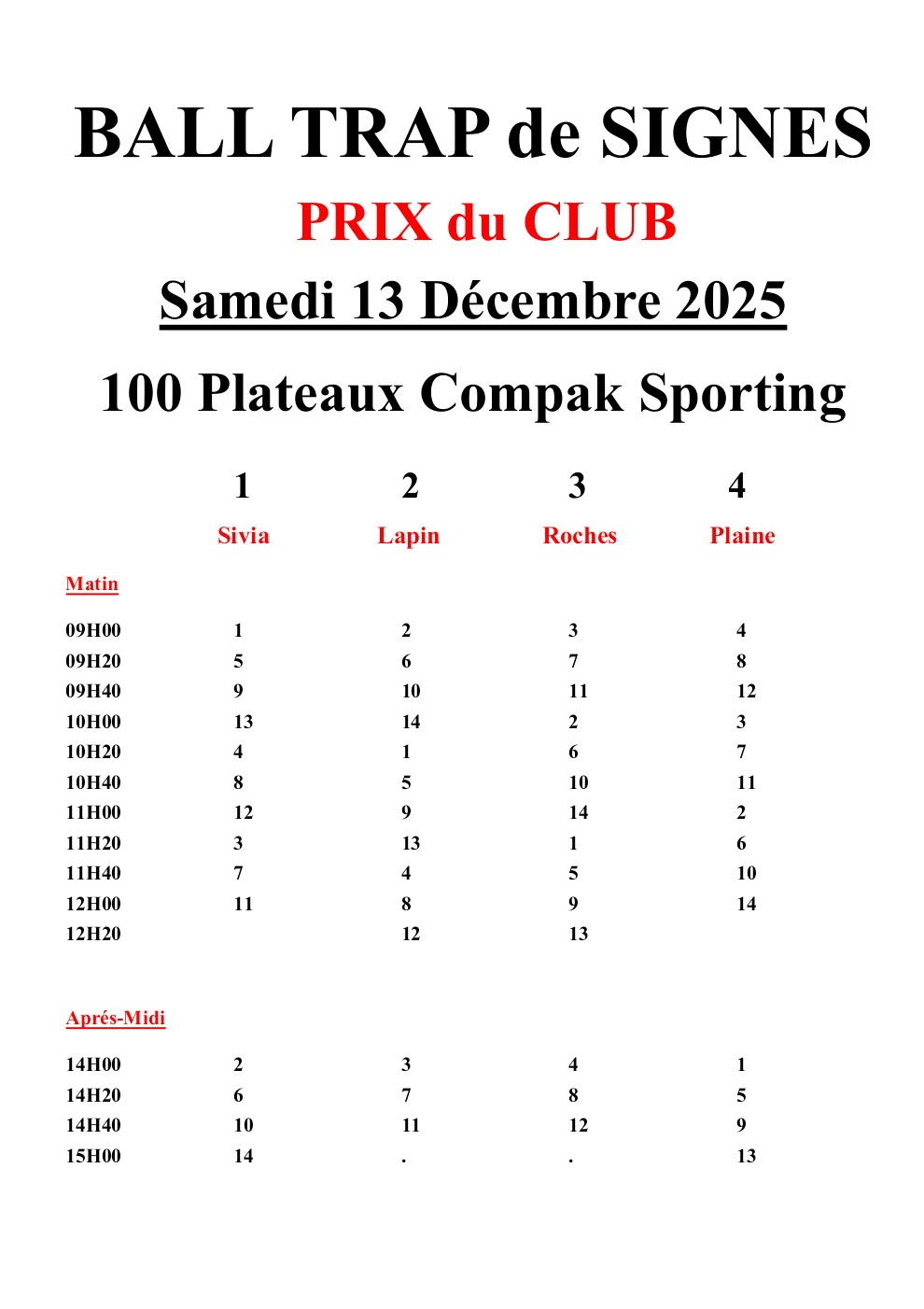 100 plateaux en Compak Sporting samedi 13 décembre pour le PRIX DU CLUB.