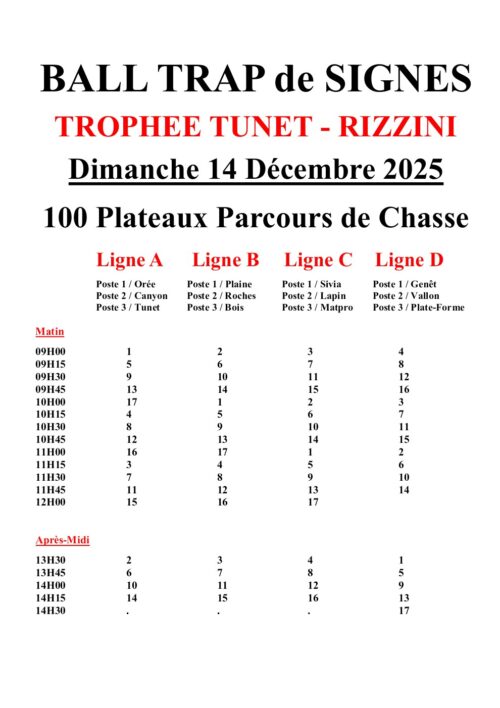 100 plateaux en Parcours de Chasse dimanche 14 décembre pour le Trophée TUNET RIZZINI.